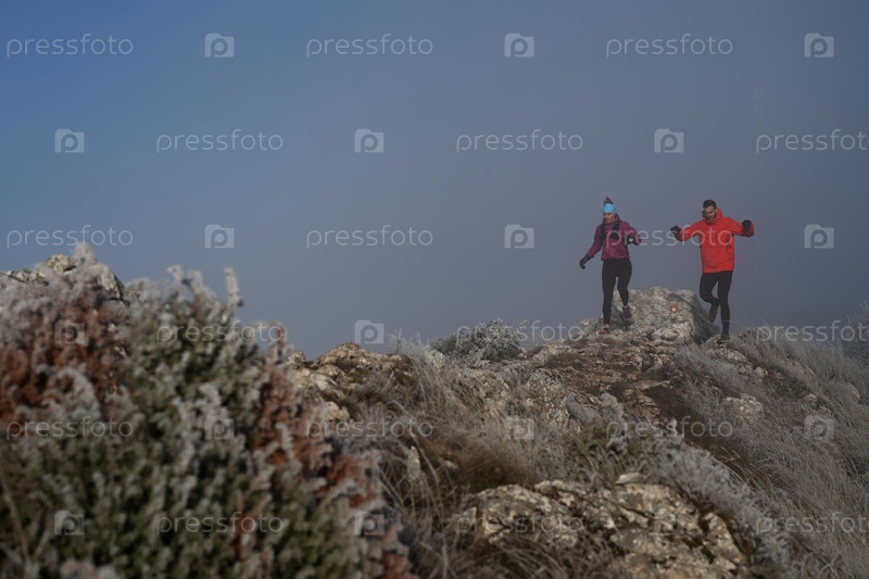 Пара, занимающаяся трейлраннингом, мужчина и женщина бегут по горной тропе