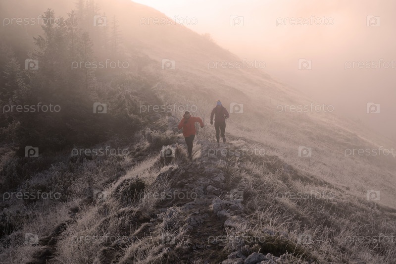 Пара, занимающаяся трейлраннингом, мужчина и женщина бегут по горной тропе