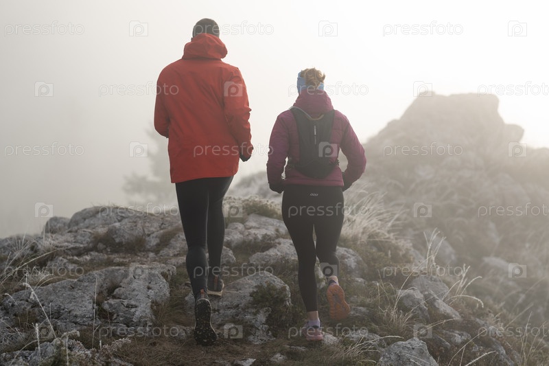Пара, занимающаяся трейлраннингом, мужчина и женщина бегут по горной тропе