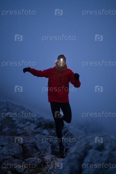 Бегун по пересеченной местности прыгает и бегает по каменистой дороге ночью на фоне полной луны