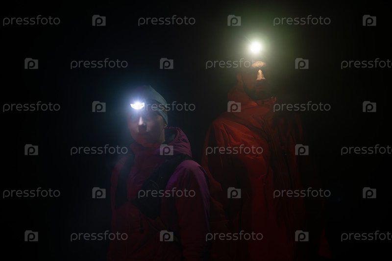 Портрет пары любителей бега по пересеченной местности во время подготовки к раннему утреннему забегу в ночное время с налобным фонарем