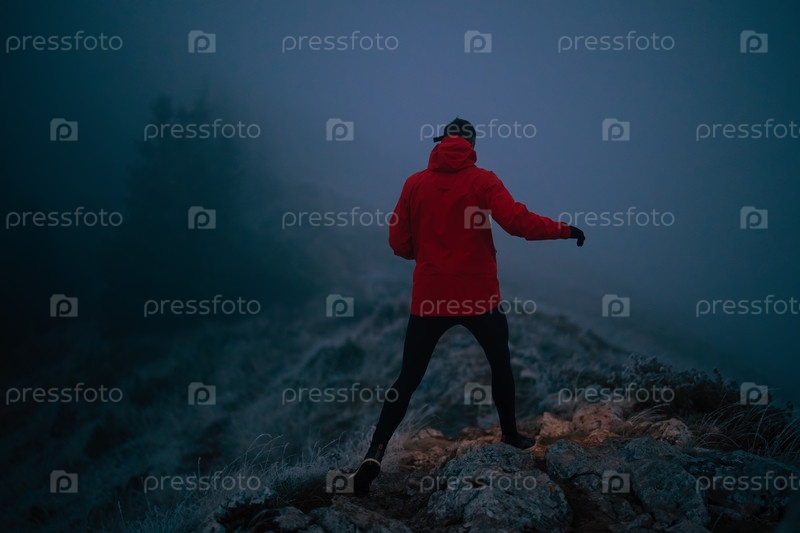 Бегун по пересеченной местности прыгает и бегает по каменистой дороге ночью на фоне полной луны