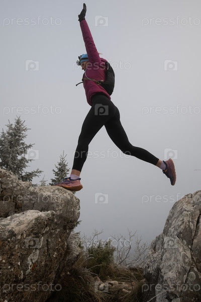 Силуэт фитнес-женщины, бегущей по пересеченной местности, которая прыгает со скалы и бежит к вершине скалистой горы