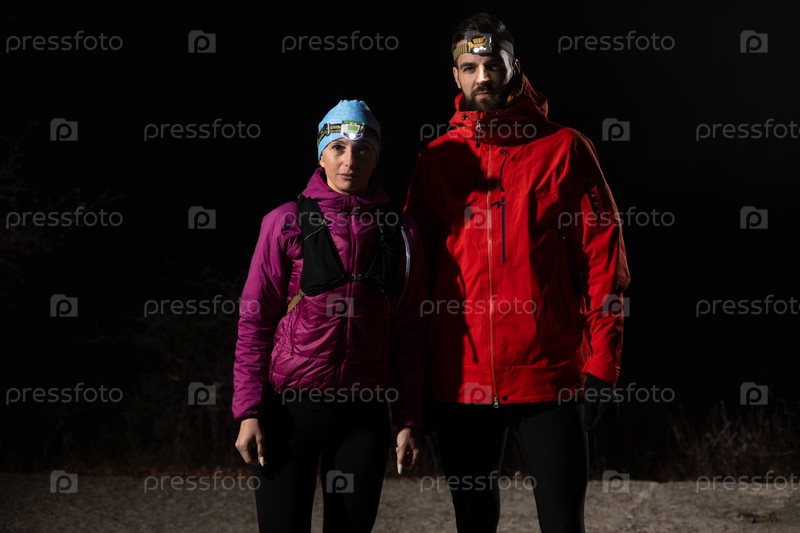 Портрет пары любителей бега по пересеченной местности во время подготовки к раннему утреннему забегу в ночное время с налобным фонарем