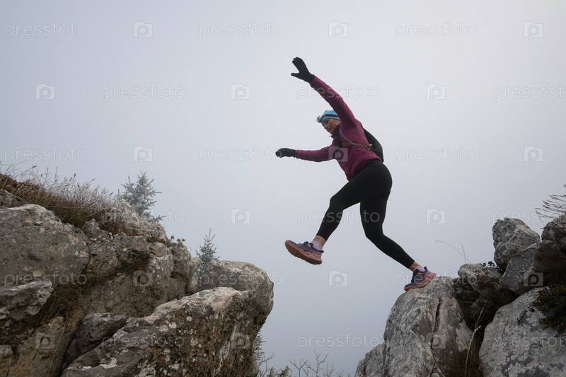 Силуэт фитнес-женщины, бегущей по пересеченной местности, которая прыгает со скалы и бежит к вершине скалистой горы