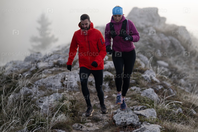Пара, занимающаяся трейлраннингом, мужчина и женщина бегут по горной тропе