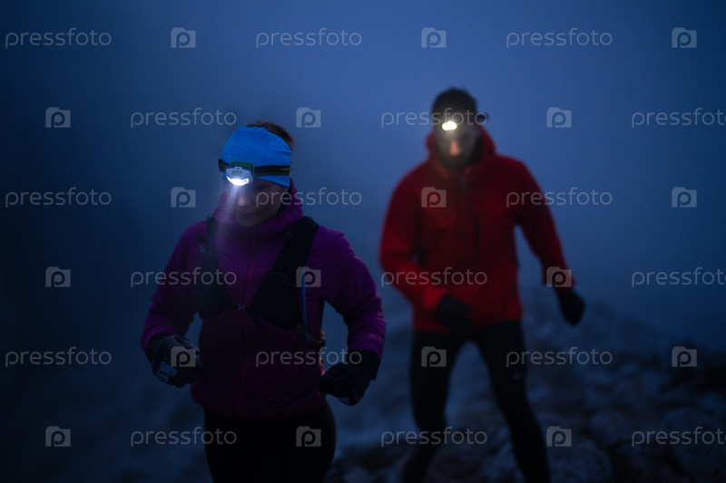 Ночной бегун по пересеченной местности среди мужчин и женщин, бегущих по горе. Ночью млечный путь