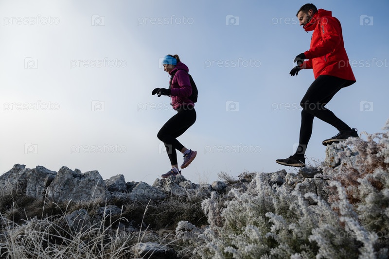 Пара спортсменов бегает по тропе на вершине горы ранним утром. Концепция небесного бега