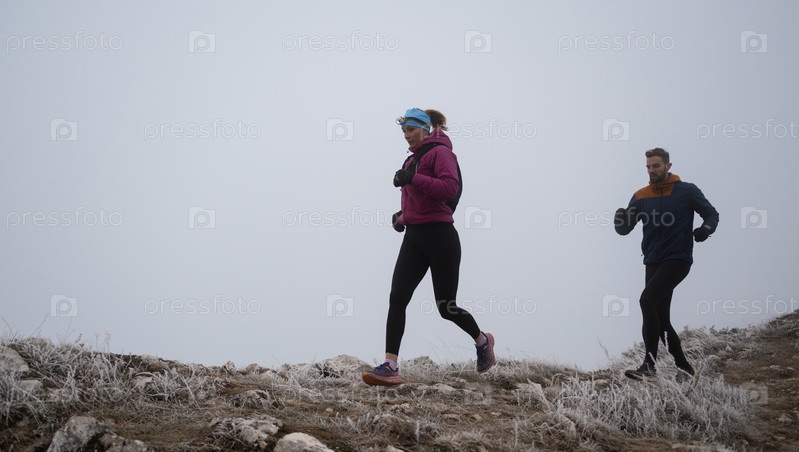 Пара, занимающаяся трейлраннингом, мужчина и женщина бегут по горной тропе