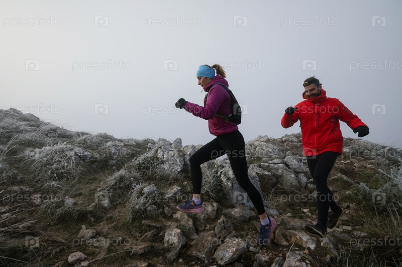 Пара, занимающаяся трейлраннингом, мужчина и женщина бегут по горной тропе