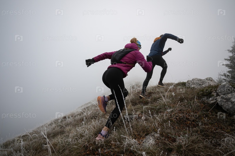 Пара, занимающаяся трейлраннингом, мужчина и женщина бегут по горной тропе