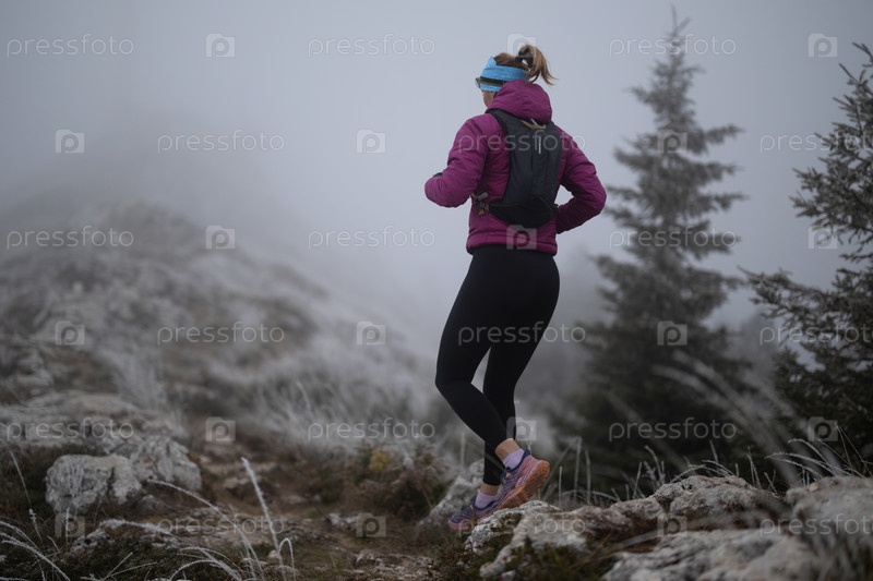 Бегунья по пересеченной местности женщина-спортсменка тренируется для ультрамарафона в горах