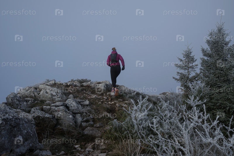 Бегунья по пересеченной местности женщина-спортсменка тренируется для ультрамарафона в горах