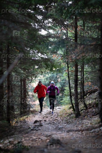 Бег по пересеченной местности со спортивной парой в волшебном лесу ранним утром
