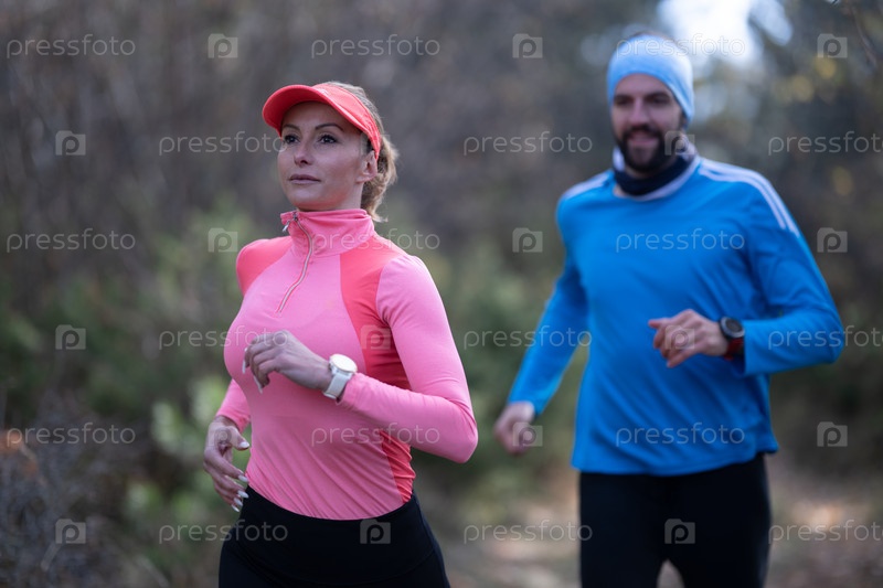 Бег по пересеченной местности со спортивной парой в волшебном лесу ранним утром