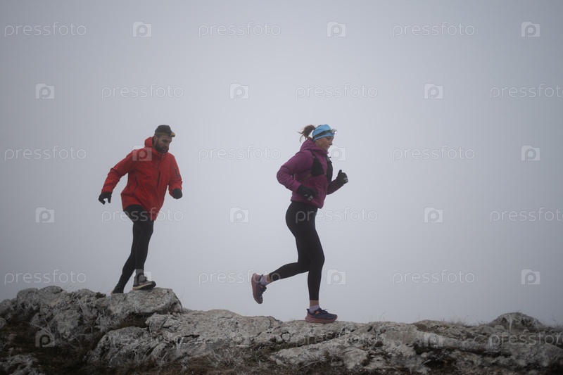 Пара спортсменов бегает по тропе на вершине горы ранним утром. Концепция небесного бега