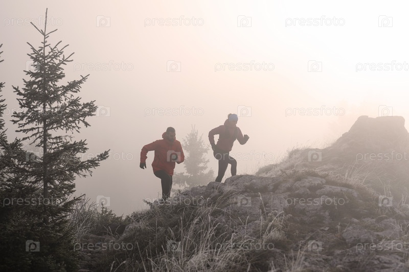 Пара, занимающаяся трейлраннингом, мужчина и женщина бегут по горной тропе