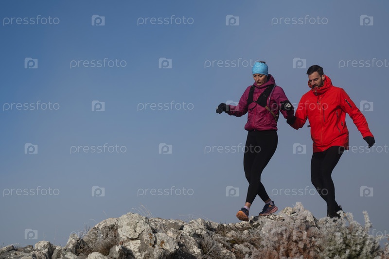 Пара, занимающаяся трейлраннингом, мужчина и женщина бегут по горной тропе