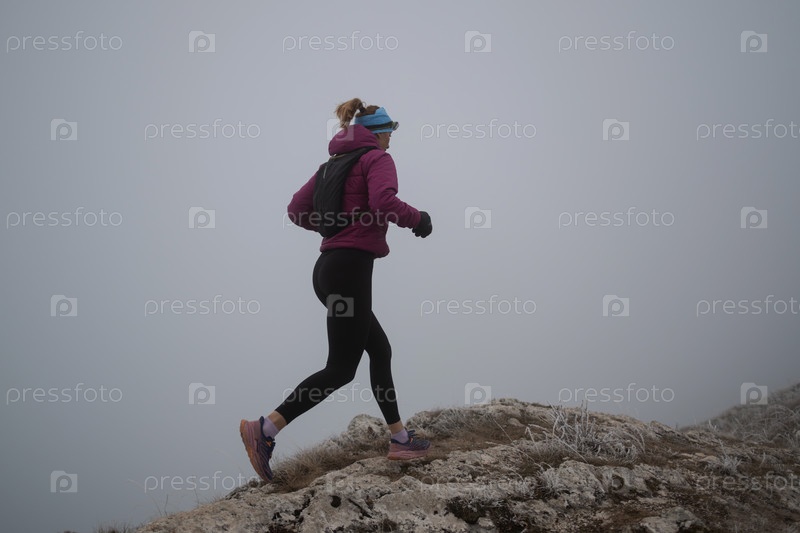 Женщина, занимающаяся скайраннингом или трейлраннингом, тренируется на вершине горы
