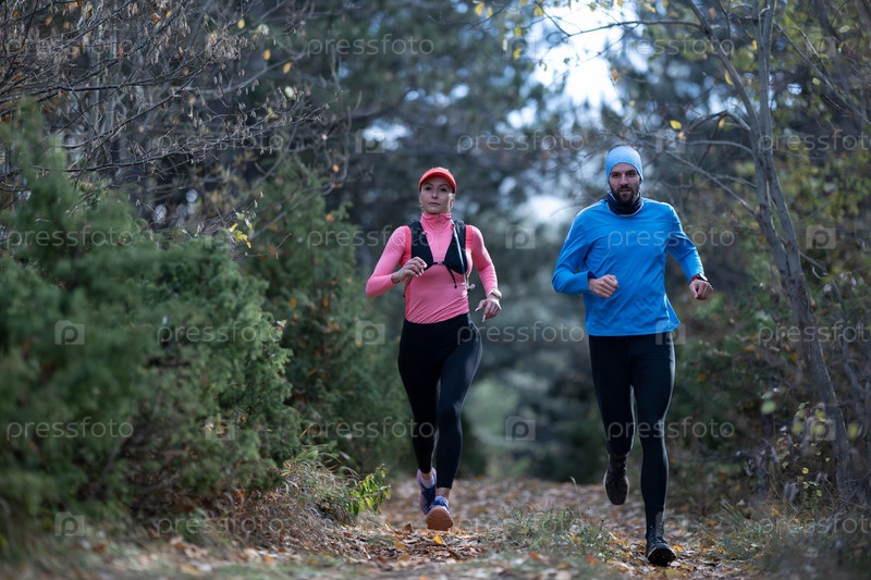 Бег по пересеченной местности со спортивной парой в волшебном лесу ранним утром