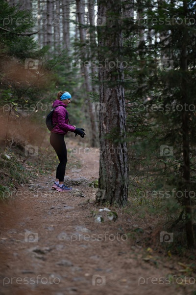 Бегунья по пересеченной местности и походница, которая использует светящиеся элементы во время бега по пересеченной местности и похода