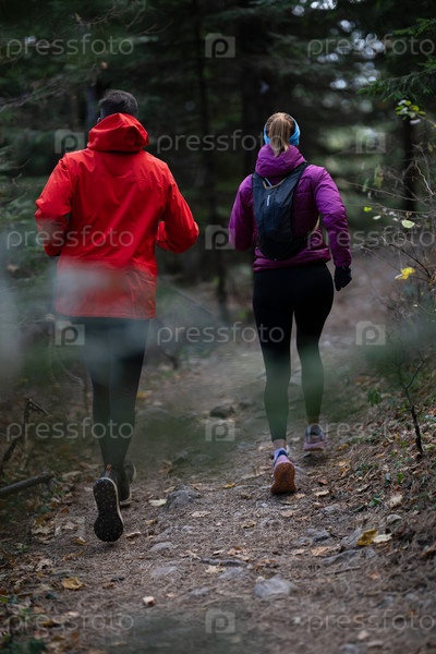 Бег по пересеченной местности со спортивной парой в волшебном лесу ранним утром