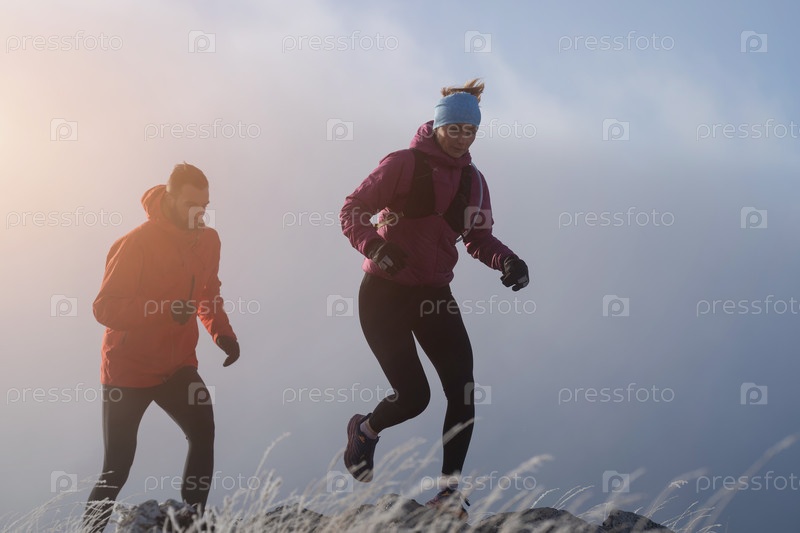 Пара спортсменов бегает по тропе на вершине горы ранним утром. Концепция небесного бега