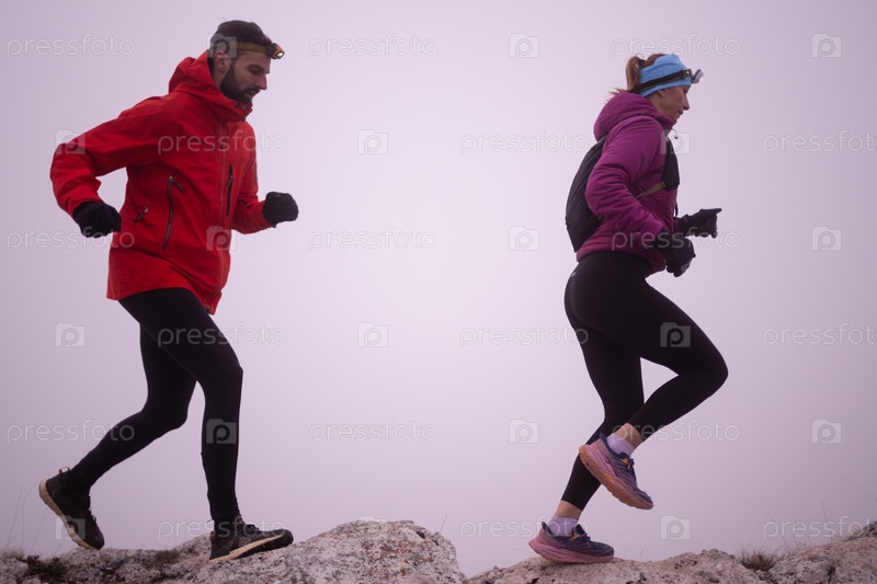 Пара спортсменов бегает по тропе на вершине горы ранним утром. Концепция небесного бега