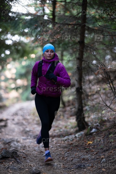 Бегунья по пересеченной местности женщина-спортсменка тренируется для ультрамарафона в горах