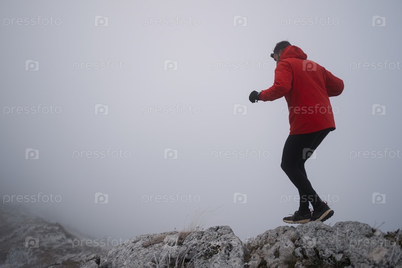 Женщина, занимающаяся скайраннингом или трейлраннингом, тренируется на вершине горы