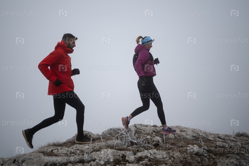 Пара спортсменов бегает по тропе на вершине горы ранним утром. Концепция небесного бега