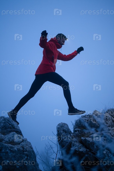 Силуэт бегуна по пересеченной местности, прыгающего со скалы и бежащего к вершине скалистой горы ранним утром