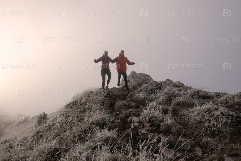 Пара, занимающаяся трейлраннингом, мужчина и женщина бегут по горной тропе