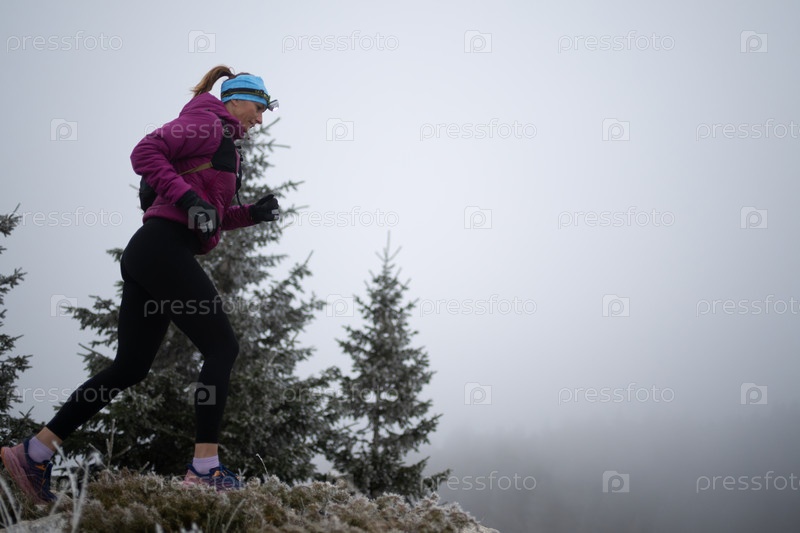 Женщина, занимающаяся скайраннингом или трейлраннингом, тренируется на вершине горы