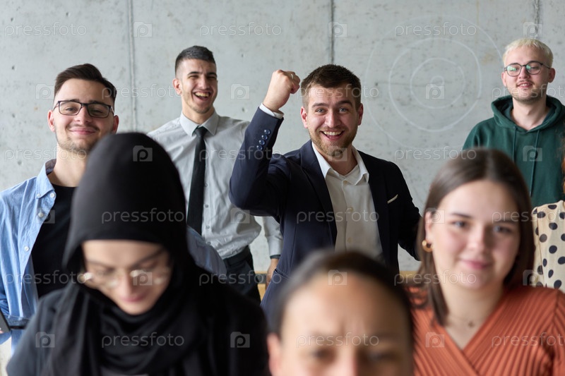 Разнообразная команда профессионалов бизнеса восторженно празднует свой успех в современном офисе, выражая триумф и единство после достижения своих целей