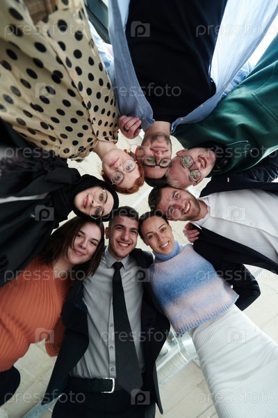 Группа разнообразных деловых людей, стоящих вместе в мощной, сплоченной позе, запечатленная с низкой точки зрения, излучает уверенность и командную работу