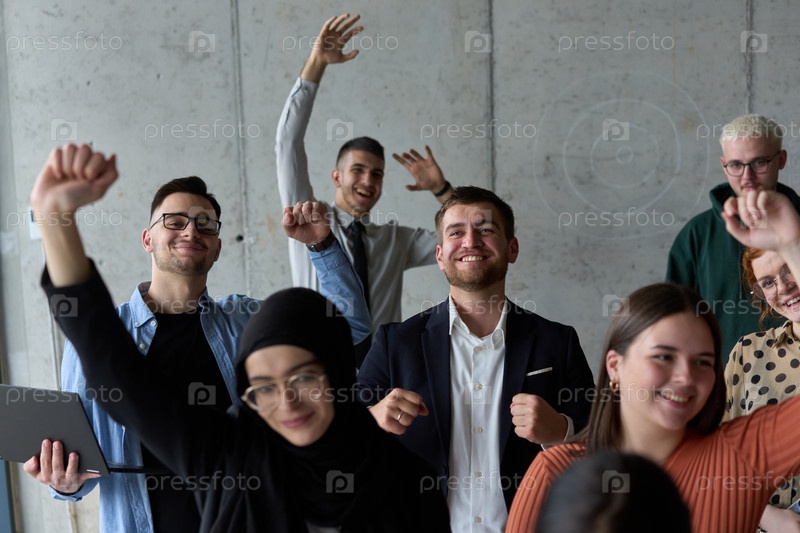 Разнообразная команда профессионалов бизнеса с восторгом празднует свой успех в современном офисе, выражая триумф и единство после достижения своих целей