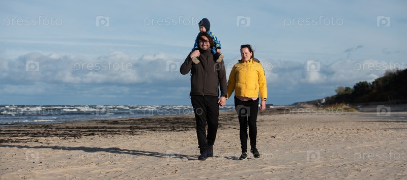 Счастливая семья прогуливается по прохладному осеннему пляжу, а их маленький сын радостно бежит впереди, создавая незабываемые воспоминания, пока свежий ветер и успокаивающие волны окутывают их в момент чистого единения