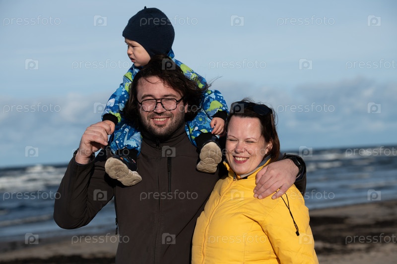 Счастливая семья прогуливается по прохладному осеннему пляжу, а их маленький сын радостно бежит впереди, создавая незабываемые воспоминания, пока свежий ветер и успокаивающие волны окутывают их в момент чистого единения