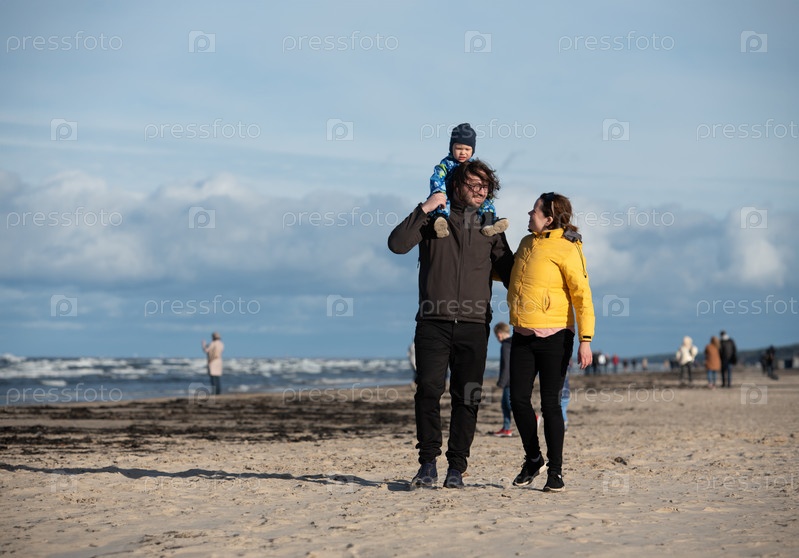 Счастливая семья прогуливается по прохладному осеннему пляжу, а их маленький сын радостно бежит впереди, создавая незабываемые воспоминания, пока свежий ветер и успокаивающие волны окутывают их в момент чистого единения
