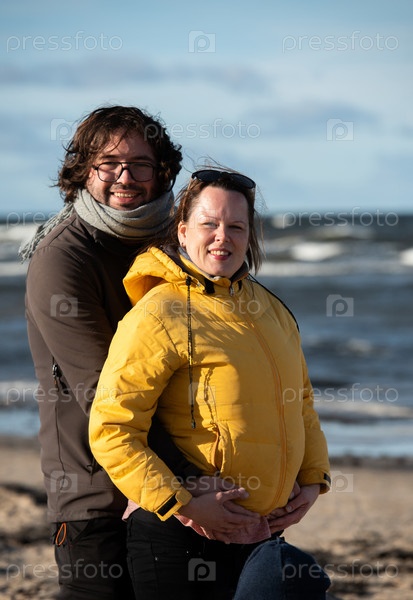 Пара стоит обнявшись на песчаном пляже в холодный осенний день, позади них простирается безмятежный океан, и они разделяют тихий момент любви и тепла среди прохладного бриза и мирной обстановки