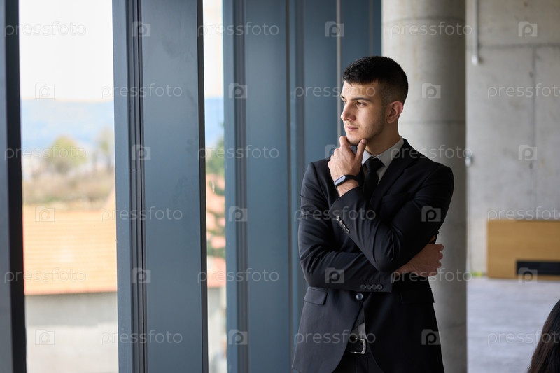 Крупным планом изображен директор компании в черном костюме, уверенно стоящий в современном офисе и излучающий лидерство, профессионализм и авторитет