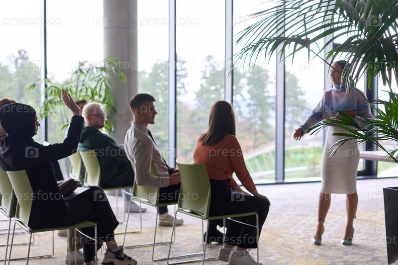 Бизнес-леди-лидер проводит встречу с коллегами, обсуждая проблемы бизнеса, маркетинговые стратегии и новые планы роста и успеха