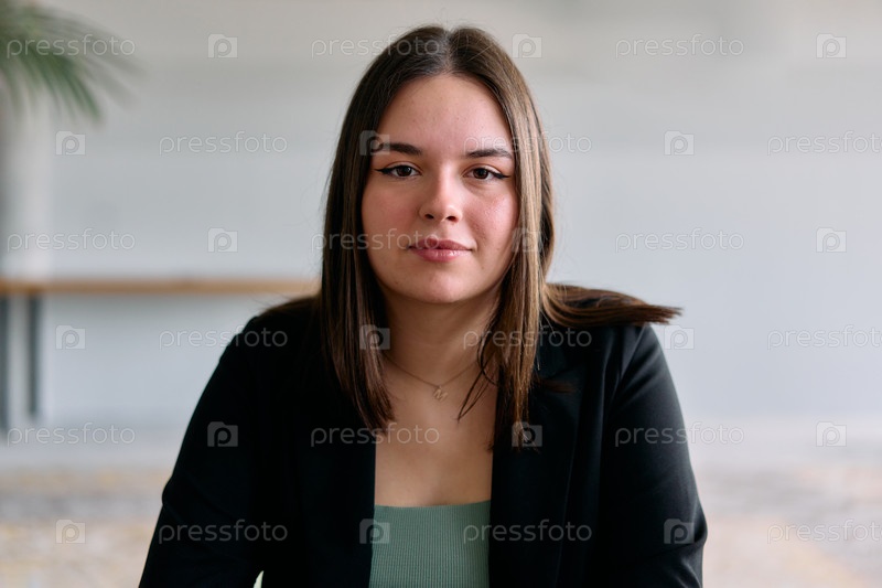Портрет молодой бизнес-леди крупным планом, участвующей в профессиональной встрече, уверенно обсуждающей идеи и стратегии со своими коллегами