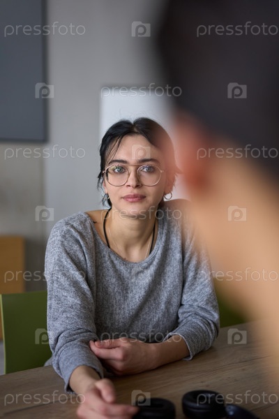 Портрет молодой бизнес-леди крупным планом, участвующей в профессиональной встрече, уверенно обсуждающей идеи и стратегии со своими коллегами