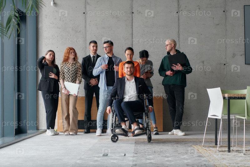Группа разнообразных профессионалов бизнеса, идущих вместе по офису, символизирует единство и силу сплоченной и успешной команды