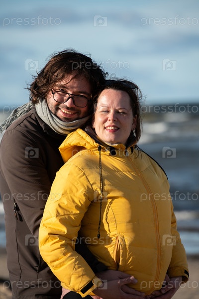 Пара стоит обнявшись на песчаном пляже в холодный осенний день, позади них простирается безмятежный океан, и они разделяют тихий момент любви и тепла среди прохладного бриза и мирной обстановки