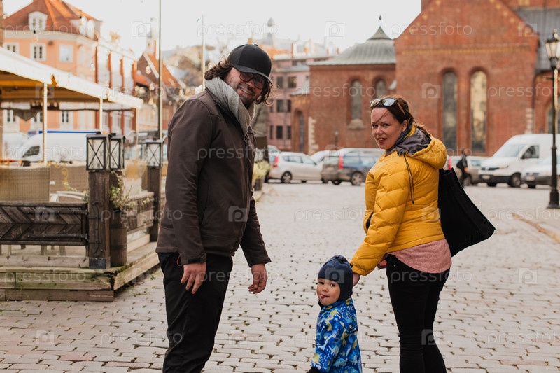 Родители идут рука об руку со своим сыном по очаровательным городским улицам, наслаждаясь теплом времени года и создавая радостные воспоминания вместе