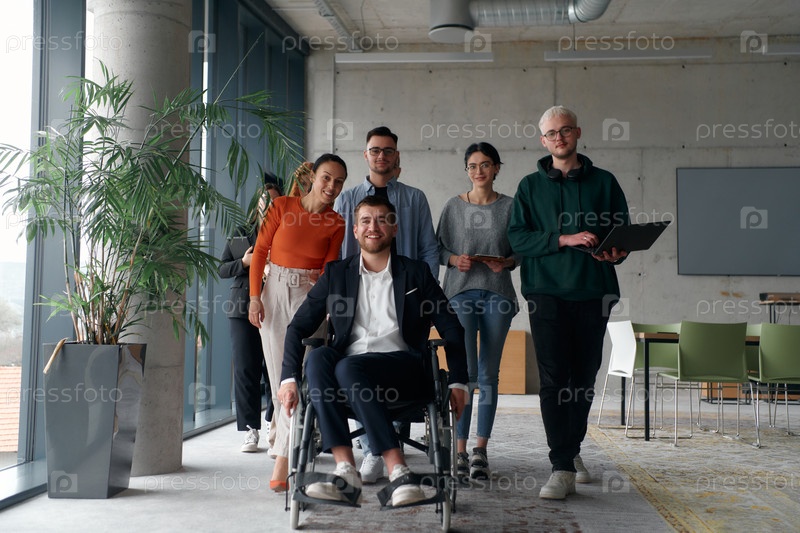 Группа разнообразных профессионалов бизнеса, идущих вместе по офису, символизирует единство и силу сплоченной и успешной команды