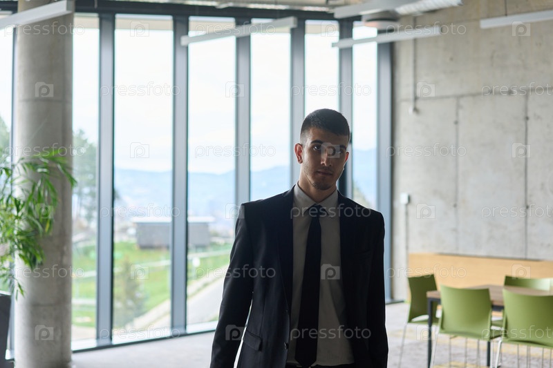 Решительный бизнесмен в черном костюме уверенно идет по офису, олицетворяя профессионализм и сосредоточенность на пути к новым вызовам